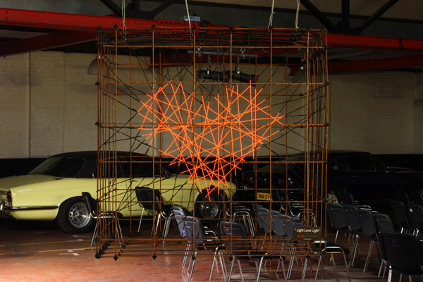 The heart design is rendered by layers of electroluminescent, bound within a rusted steal cage. The piece consists of seamingly random glowing red lines which form a heart shape when viewed from the right angle.