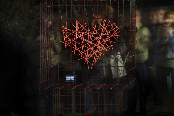 Unlike its preprocessor, which was suspended, this version is free standing and is just under 2 meter tall. It consists of two different size steel cages, with the smaller one acting as the plinth where the larger one contains the "randomly" strung red Electro Luminescent wires that when viewed from the right perspective, render a heart shape.